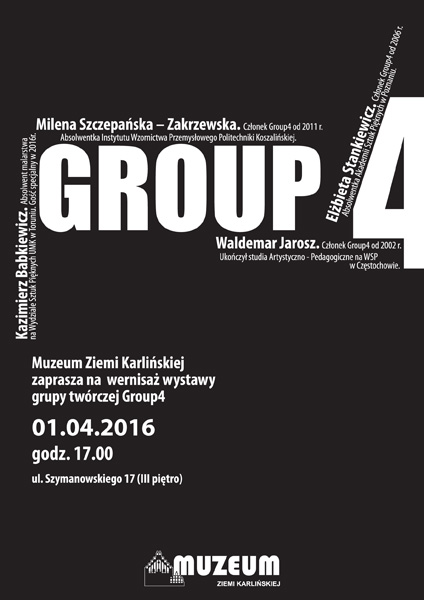 Group 4 w składzie:M.Szczepańska-Zakrzewska, ,E.Stankiewicz, W.Jarosz oraz zaproszony gość Kazimierz Babkiewicz pokażą swoje prace w Muzeum Ziemi Karlińskiej.Komisarzem wystawy jest Milena Szczepańska -Zakrzewska.