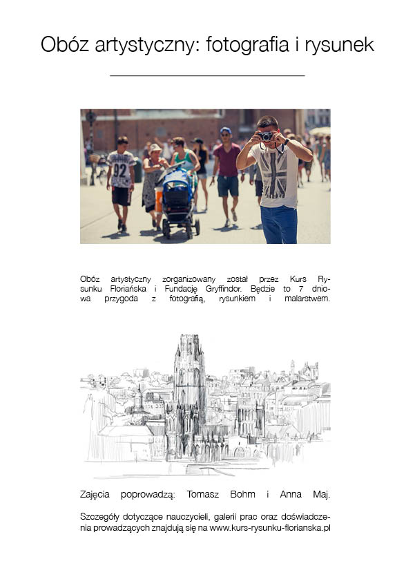 Zorganizowany wyjazd mający na celu skompletowanie teczki prac, promocję rysunku i malarstwa oraz naukę fotografii. Kurs rysunku i fotografii przeznaczony dla osób dorosłych. Wylot z Krakowa. Cena za dokonanie płatności do końca lipca 2200, do 10 sierpnia 2600